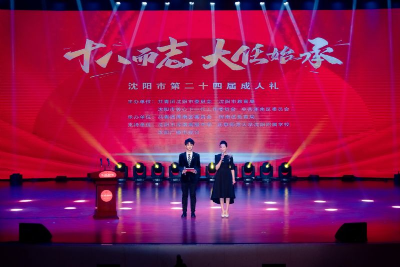 在我院学生李涵、苏志强演唱的《青春沈阳》热情的旋律中,本届成人礼拉开帷幕。歌曲以明快的音乐节奏、向上的思想内涵,勾勒出沈阳青年以梦为马、不负韶华,在新时代辽宁全面振兴“辽沈战役”主战场无惧风雨、锐意进取的生动场景。我院学生胡杨铣钊、丁一、李浩宁演唱的歌曲《青春》《未来我来》以优美的旋律、质朴的语言和真挚的情感,喊出了广大青年挑大梁担大任、当先锋做表率的青春誓言。此外,我院戏剧影视学院学生范凯鑫受邀与沈阳广播电视台著名主持人宫正共同主持本届成人礼。