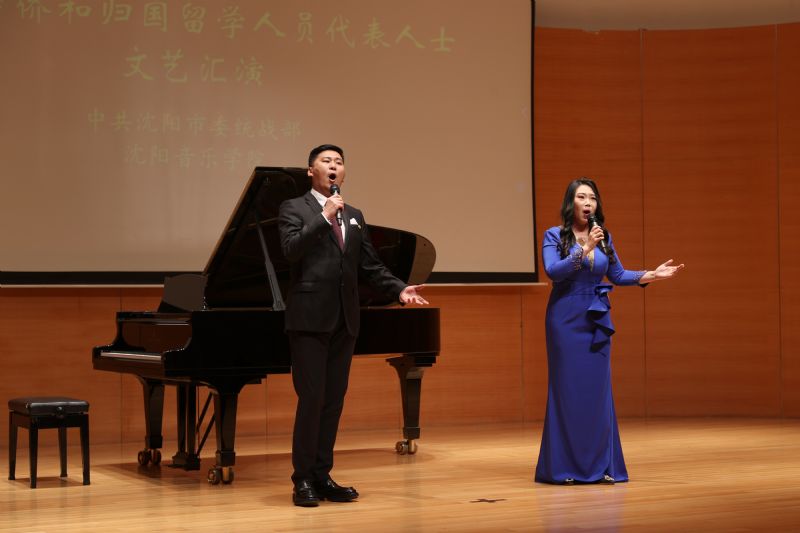 我院声歌系教师、省欧美同学会理事刘博,我院艺术实践教学中心副主任、沈音知联会副会长、省欧美同学会理事朱晏锋演唱《共筑中国梦》