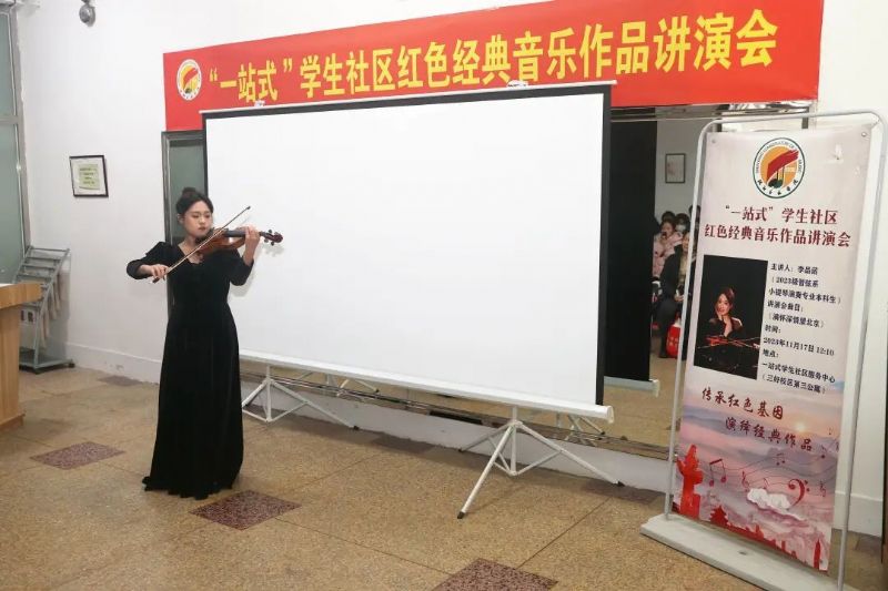 本期讲演会曲目为《满怀深情望北京》(小提琴版),由管弦系2023级本科生李品诺主讲。同时,应相关社区领导的要求,本期讲演会对往期部分优秀讲演曲目进行了展演。讲演会上,李品诺与民族器乐系2022级本科生梅依燃、民族声乐系2022级研究生黄瑶3位主讲人紧扣“红色经典音乐”主题,结合自身专业学习以及对作品的感悟,分别讲述了乐曲《满怀深情望北京》(小提琴版)、《井冈山上太阳红》(古筝版)和歌曲《万泉河水清又清》《红色娘子军军歌》等作品的创作故事,阐释了这些经典音乐作品之所以广为流传、经久不衰的原因,并详细讲解了作品曲式结构以及在演奏、演唱过程中的情感表达。李品诺和梅依燃分别为现场观众完整演奏了《满怀深情望北京》(小提琴版)和《井冈山上太阳红》(古筝版)。来自民族声乐系女子民歌合唱团的8名成员与来自钢琴系的2023级研究生于庆凯作为特邀嘉宾,与黄瑶一起为现场观众带来经典歌曲《万泉河水清又清》《红色娘子军军歌》。