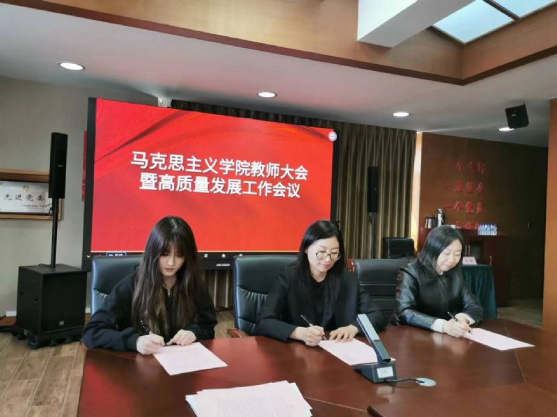 会上,申淑征传达了本学期学院相关会议精神,对推动马克思主义学院高质量发展作了工作安排。党总支副书记丁楠与全体教师签订《马克思主义学院教师落实师德师风及意识形态工作责任承诺书》。副院长宋玉静、王丹分别结合分管工作,就落实学院高质量发展攻坚突破三年行动方案和2024年工作要点作了发言。