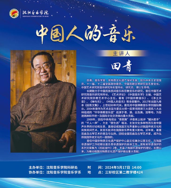 长期致力于中国民族民间音乐和宗教音乐的研究,曾任中国艺术研究院音乐研究所所长、《艺术评论》《中国音乐学》主编、中国艺术研究院宗教艺术中心主任,著有《中国宗教音乐》、《净土天音》、《禅与乐》、《中国人的音乐》等多部著作,2017年出版九卷本《田青文集》。上世纪80年代末,首先将中国佛教音乐带到国际舞台,2004年曾作为艺术总监与星云大师一起率领两岸三大语系八大丛林组成的“中华佛教音乐团”巡演于港、澳、台及美、加等地,为促进两岸和平统一及国际文化交流做出重大贡献。