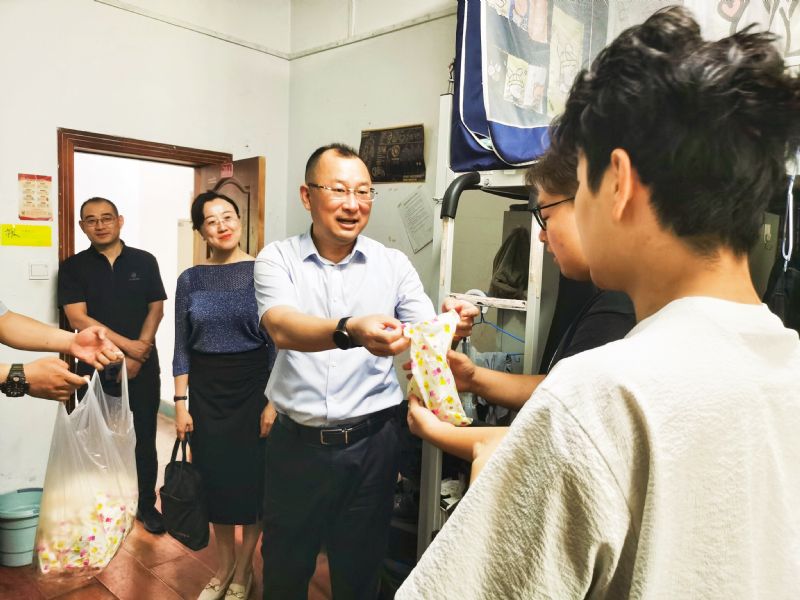孙旭东一行首先看望了因排演而未能回家过节的学生们,为同学们送上节日问候和祝福,嘱咐大家认真排演,不负“粽”望。随后,他深入各校区学生公寓,为节日留校学生发放了爱心礼包——香甜的粽子、鸡蛋、精美的五彩绳,仔细询问了学生的学习和生活情况,并提醒同学们注意宿舍用电安全、在校期间严格遵守学校的各项规定,合理分配时间,度过一个平安而充实的端午节。