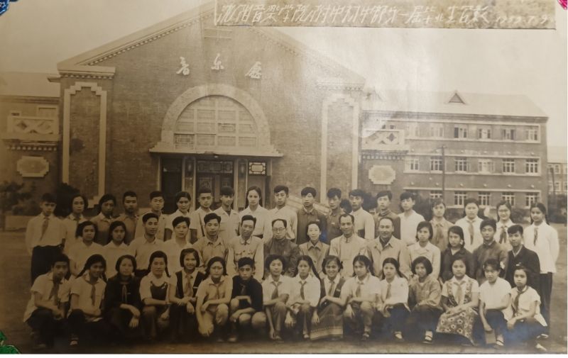 1959年7月9日老校友们于音乐厅门前拍摄毕业照(照片由李文华提供)