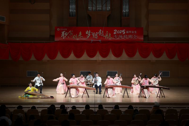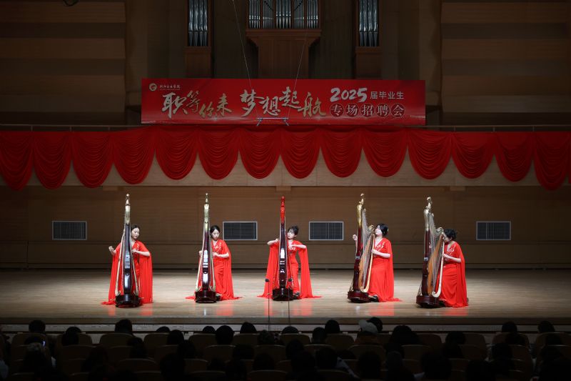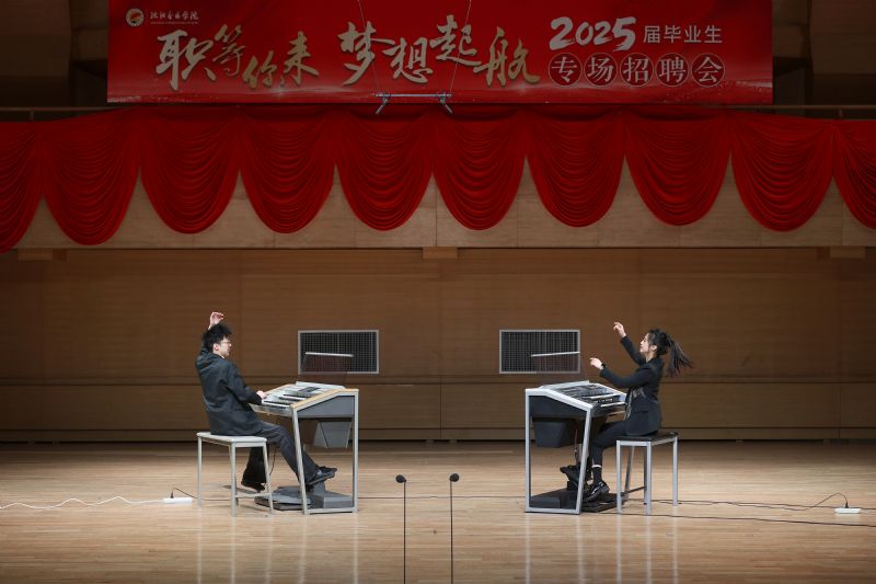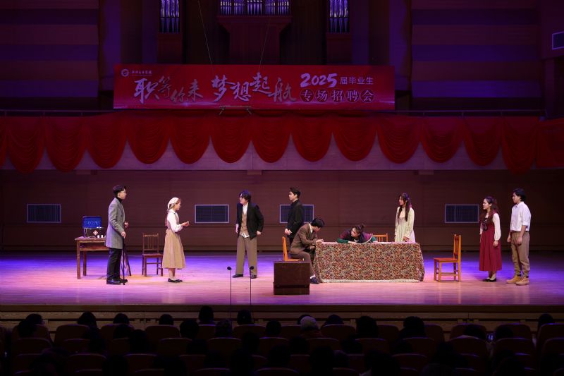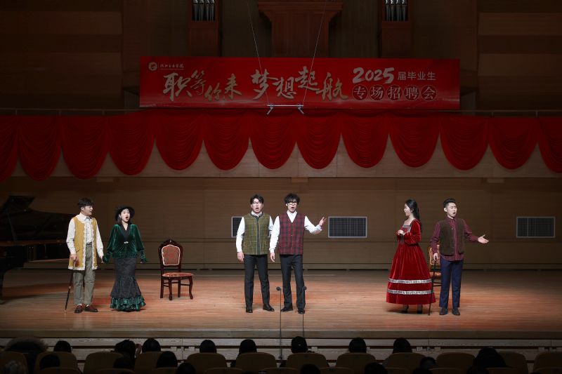 在招聘会的专业展演环节,81名毕业生作了精彩的专业展示,先后演出了电子管风琴合奏《楚天遥》、歌剧片段《天啊!是什么点燃了你的愤怒?》、舞蹈表演《旗帜》、单簧管演奏小协奏曲Op.26、话剧《油漆未干》片段、民声演唱《雷火中的笑容》、钢琴演奏升f小调幻想曲Op.28第一乐章等14个节目。毕业生们精湛的专业水平和新颖的演出形式赢得了用人单位的好评,现场掌声阵阵。展演环节由民族声乐系教师王国峰主持。