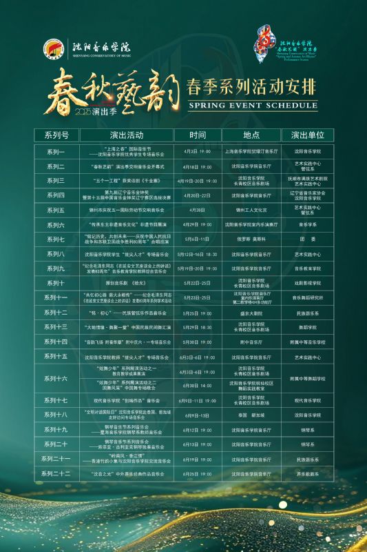 “春秋艺韵”春季演出季涵盖风格多样、形式丰富的22场次音乐会、艺术展演和戏剧类演出,从古典音乐的庄重典雅,到民族音乐的独特韵味,从流行音乐的动感活力到话剧与音乐剧的多元魅力,多种艺术形式的汇聚融合将带领观众共赴一场精彩纷呈、芳华尽放的艺术之旅。