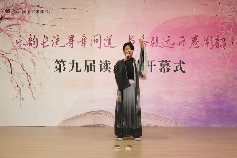 学生代表2023级音乐学系研究生卢炳卉在发言中分享了阅读感悟,展现出沈音学子对知识的热爱与积极进取的精神风貌。在节目展示环节,民族器乐系学生吴婧杨等演出民乐合奏《梅花三弄》,古琴与萧的完美交融,将观众带入冰雪消融、梅花绽放的诗意世界;戏剧影视学院学生崔高越以饱满的情感朗诵古诗词《将进酒》,展现中华传统文化的博大精深;图书馆馆员们朗诵新版《图书馆服务宣言》,彰显图书馆服务师生、传承文化的使命担当。