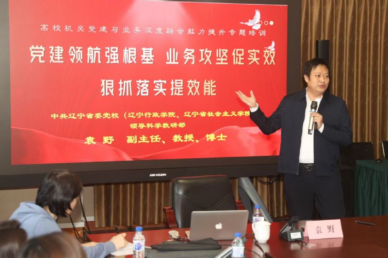 为深入贯彻党的二十大和二十届二中、三中全会精神,全面贯彻习近平总书记关于教育的重要论述,落实学院《基层党建高质量发展三年行动实施方案(2025—2027 年)》关于实施赋能聚力行动的要求,推动机关党建与业务工作深度融合,425日,机关党委邀请中共辽宁省委党校(辽宁行政学院、辽宁省社会主义学院)领导科学教研部副主任袁野教授作《党建领航强根基 业务攻坚促实效 狠抓落实提效能——高校机关党建与业务深度融合能力提升》专题培训。机关党委所辖党支部书记、党务工作者和部分院系党支部书记参加培训。培训由机关党委书记邹天伦主持。