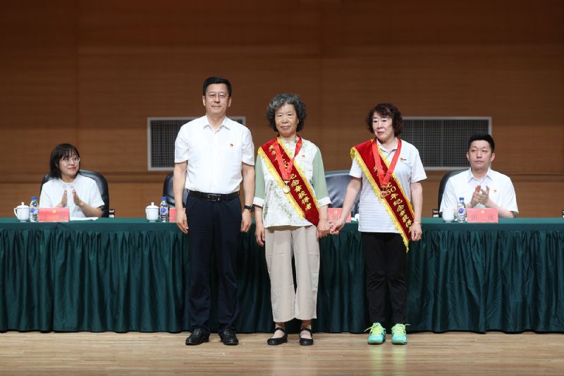 赵恒心为荣获“光荣在党50年”纪念章的老党员代表,附属中等音乐学校原教授王沿平、人事处原副处级调研员吴双玉佩戴绶带、颁发奖章,并向荣获纪念章的老党员致以崇高的敬意。