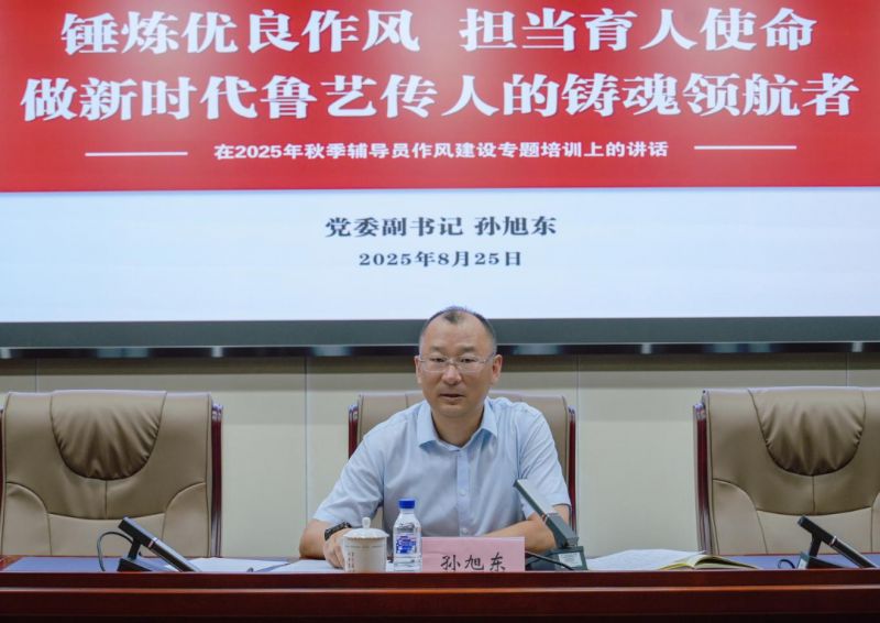 在开班仪式上,孙旭东作题为《锤炼优良作风 担当育人使命 做新时代鲁艺传人的铸魂领航者》的专题报告。他指出,在学院党委扎实开展深入贯彻中央八项规定精神学习教育的深化阶段,同时也是2025秋季学期开学之际,开展此次学工队伍专题培训正当其时且意义深远。他从深学细悟习近平总书记关于加强党的作风建设的重要论述、深刻理解辅导员队伍作风建设的重要性和必要性、深刻剖析辅导员队伍作风建设存在的主要问题、以优良作风和优异实绩助推学院高质量发展四个方面进行全面阐释。他对辅导员队伍提出殷切期望:一要始终做到“有信念”,以坚定理想引领学生航向;二要始终做到“在状态”,以满腔热忱深耕育人一线;三要始终做到“强本领”,以专业素养提升育人效能;四要始终做到“守底线”,以廉洁自律护航学生成长。他勉励辅导员坚守“平凡”,终将“不凡”,把学生管理好、教育好,在全面落实立德树人根本任务的新征程上展现新气象、实现新作为。