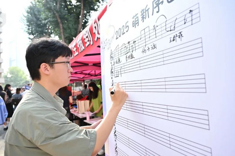 作曲系:新人新曲新起点,传承了七年的“萌新序曲”再次起笔。36名新生共谱《2025级萌新序曲》。作曲系为新生定制了环保帆布袋,袋表印有学院原创经典音乐作品。袋内装有《礼赞新时代管弦乐作品集》等精美礼物。充满诚意的伴手礼让新生深切感受到沈音厚重的历史和专业高度。新生手写自己的期望投入梦想邮箱。