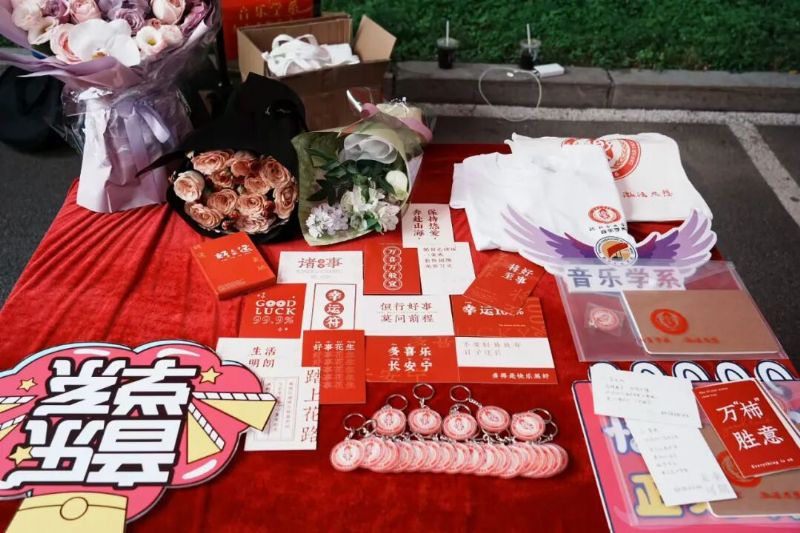 音乐学系: 为学生精心设计印有音乐学系标的系服、帆布袋、钥匙扣、笔记本等。同时,学长学姐们为每一名新生手写专属祝福明信片,特别用心地准备了盲盒转盘,设计迎新破冰互动活动,音乐学系高瑜泽同学自编自导特色曲艺节目表演,让新生印象深刻。