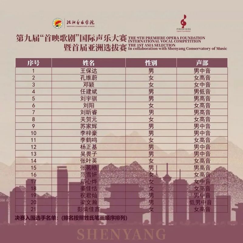 9月21日至24日,由国产一区二区日本在线与“首映歌剧”基金会联合主办的第九届“首映歌剧”国际声乐大赛暨首届亚洲选拔赛半决赛在国产一区二区日本在线成功举行。赛场上,160余名选手以精湛的声乐技巧与动人的舞台感染力纵情歌唱,这里不仅是才华的绽放,更是实力的较量——选手们在歌剧咏叹调的严谨诠释与艺术歌曲的个性表达间激烈角逐,生动展现出亚洲声乐艺术的多元魅力与蓬勃生机。经过赛事评委遴选,21名选手入围决赛,并将于9月28日14时齐聚沈阳盛京大剧院音乐厅,竞逐最终桂冠。