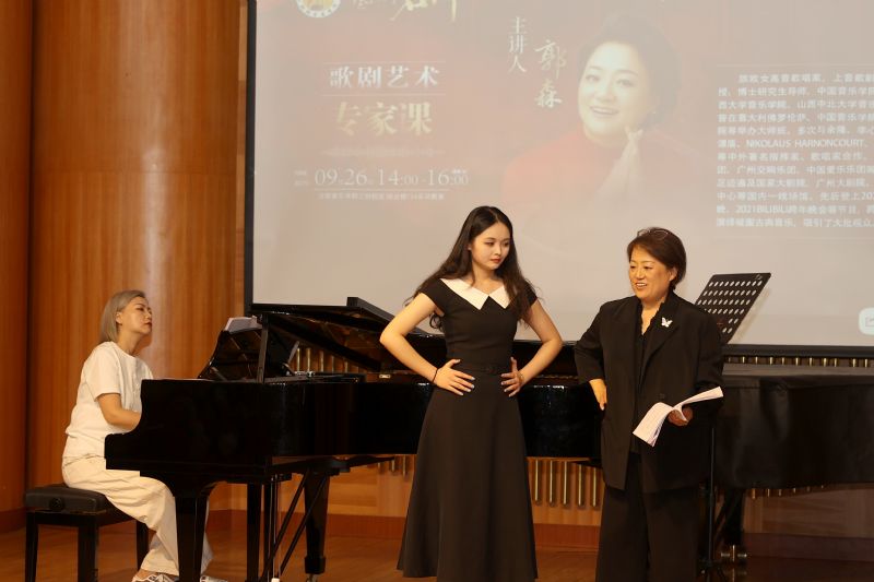 郭森聚焦中外声乐作品的精准演绎,结合自身丰富的国际舞台经验,从技术细节到语言规范,再到情感表达和人物塑造等方面,对学生进行了全方位的指导。她强调在演唱中既要修炼纯净的音色,更要追求戏剧的张力。她现场进行示范演唱并结合细致的讲解,用生动形象的比喻帮助在场师生理解抽象的声乐技巧。